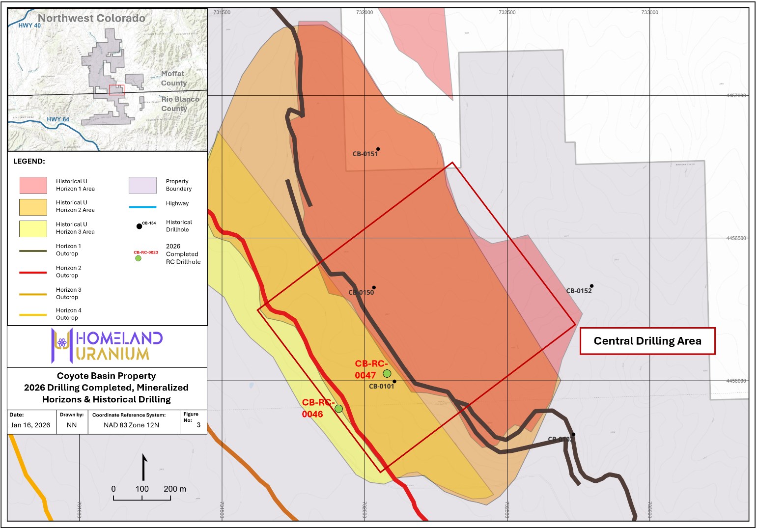 Elevated radioactivity typically occurs at relatively shallow depths, generally between approximately 50 and 100 metres (164-328 feet) below surface. The radiometric response and lithologies encountered in Holes CB-RC-0043 through CB-RC-0045 are consistent with those observed in the Company's previously reported drill holes (see the Company's news release dated December 15, 2025, December 22, 2025 and January 8, 2026, available on the Company's website at https://www.homeland-uranium.com/news-releases or under its profile on SEDARplus.ca). Anomalous radioactivity is observed primarily within the shales, claystones, and fine-grained sandstones of the Upper Member of the Fort Union Formation. A potential second zone of elevated radioactivity was observed below approximately 220 metres (722 feet) in drillhole CB-RC-0023 and remains open for follow-up during future drilling programs.